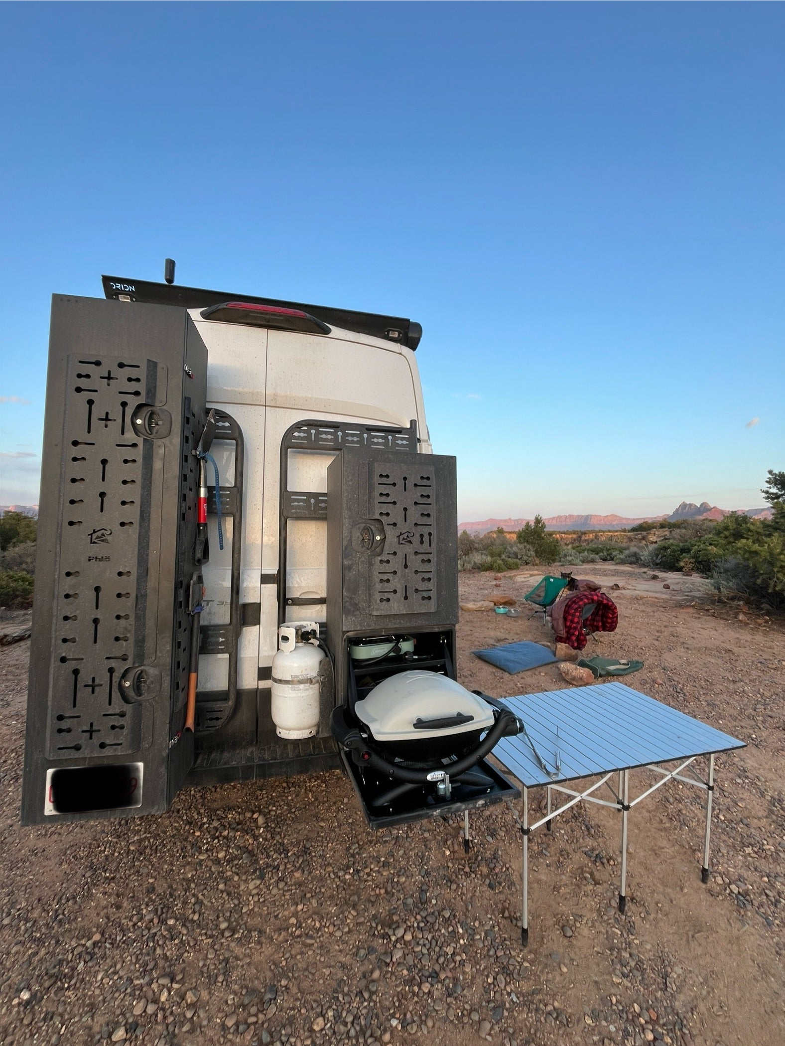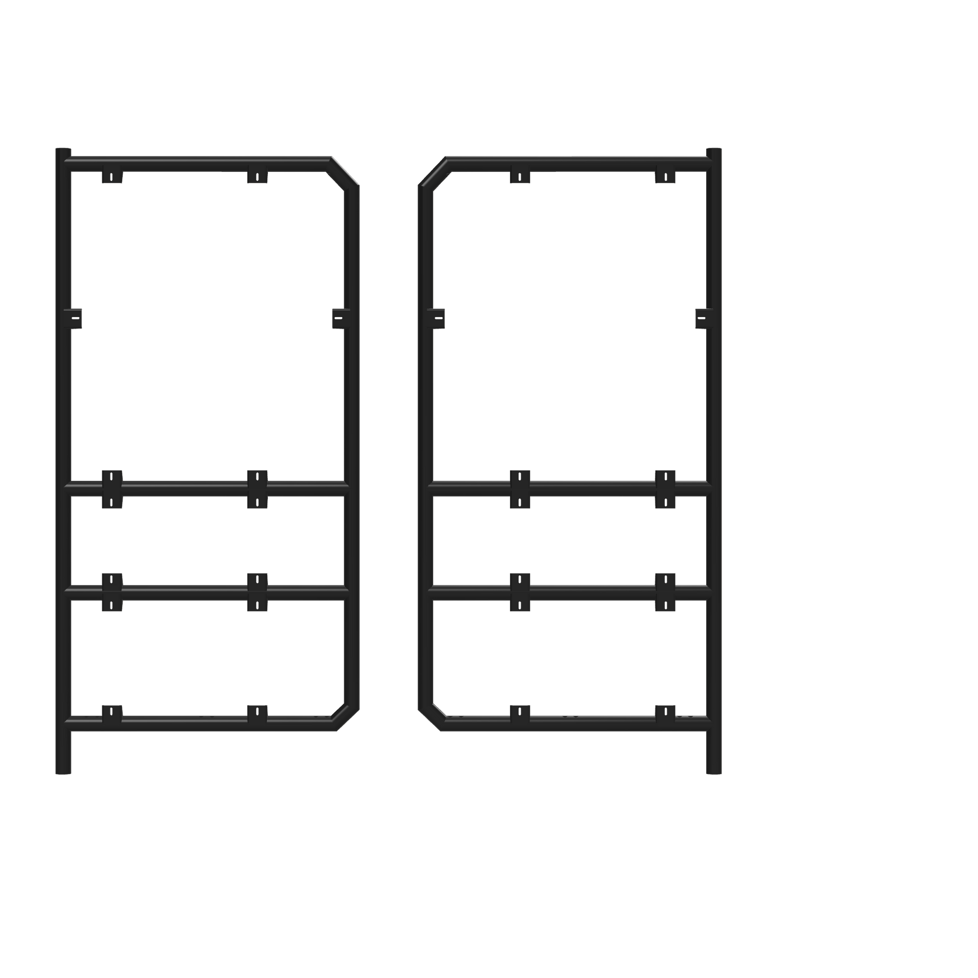 Full door support for Ford Transit 2015+. This tubular support allows the installation of small and medium trunks, as well as the possibility of installing a large ski and snowboard trunk. It is possible to add perforated panels (sold separately) in the lower and/or upper section for the installation of various practical accessories such as wood baskets, Maxtrax, Rotopax and others. The supports follow the opening movement of the doors, which facilitates access to the interior of the vehicle.
