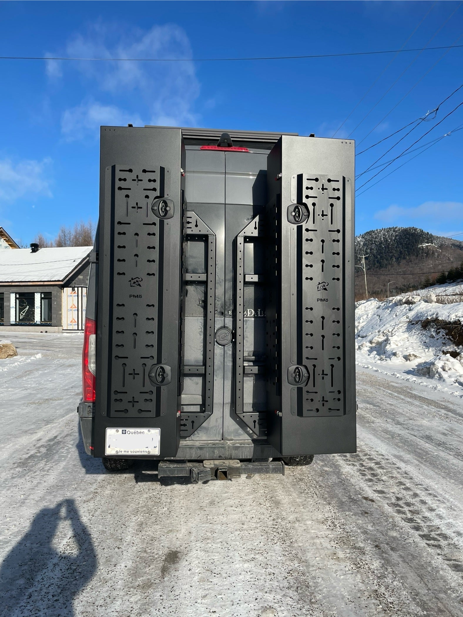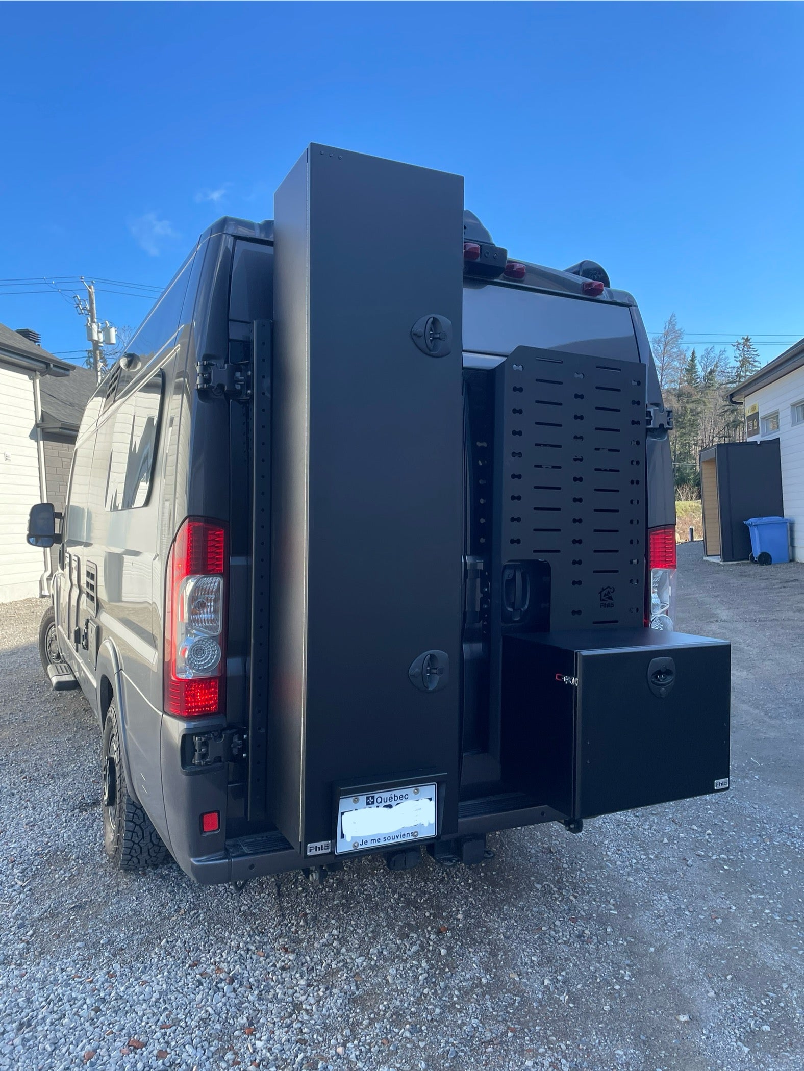 Ce coffre offre une grande capacité de chargement pour vos accessoires de toutes les saisons, que ce soit pour les articles de sport comme les skis et snowboards, ou pour les accessoires de kitesurf, chaises, poussettes, pagaies ou autres articles longs difficiles à placer à l'intérieur du véhicule et souvent humides ou sales. Sa construction entièrement en aluminium et ses soudures TIG garantissent une qualité inégalée. L'utilisation d'aluminium d'une épaisseur de 0,080 pouce permet à la boîte d'être à la fois ultra-robuste et légère. Il est équipé de deux serrures à bascule à compression avec verrouillage à clé, de deux loquets à bascule pour une meilleure étanchéité, et d'une charnière piano en acier inoxydable. Il est possible d'ajouter des éléments tels qu'une façade de porte perforée, des panneaux latéraux externes multi-trous et des panneaux internes multi-trous pour l'attachement et la fixation d'accessoires. . Il contient un système de rails internes pour accueillir des tablettes au besoins.