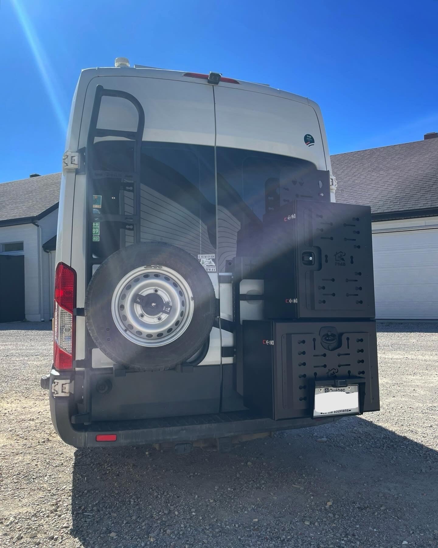 Support de pneus de secours avec échelle intégrée pour porte arrière gauche côté conducteur pour Ford Transit 2015+. Les supports s’installent sur la boulonnerie déjà existante des portes et ne nécessitent aucun perçage de nouveau trou dans les portes. Le support est ajustable pour une grande variété de grandeurs de pneus et il y a 2 adaptateurs de fixation pour la roue en acier ou les jantes. L’échelle de 4 marches pleine grandeur en haut et 3 petites marches en bas sur la structure tubulaire. Les supports suivent le mouvement d'ouverture des portes, ce qui facilite l'accès à l'intérieur du véhicule.