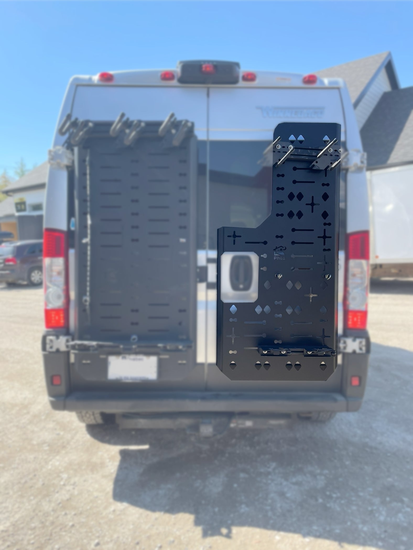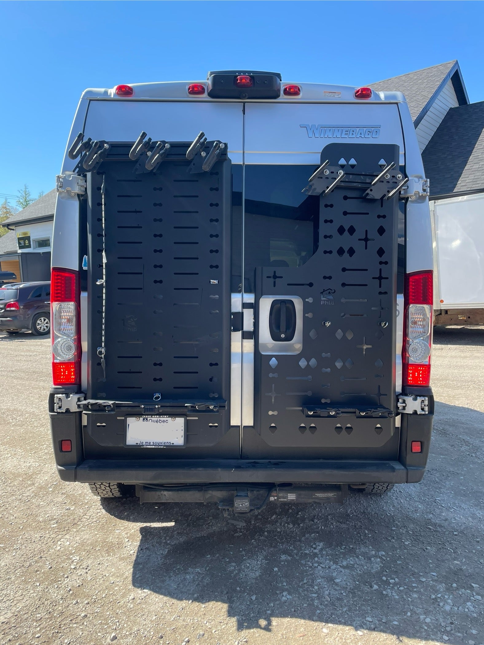 Le Support Deluxe multi-fonctions avec découpe pour une visibilité par la fenêtre arrière droite côté passager est conçu pour les véhicules Ford Transit, Ram Promaster et Mercedes Sprinter (2007-2018 et 2019+). Ce panneau perforé s’installe facilement sur la boulonnerie existante des portes, sans nécessiter de nouveaux trous pour les Transit et Promaster. Pour les Sprinter, deux petits trous supplémentaires sont nécessaires derrière le logo Mercedes pour la fixation du troisième point, mais ils sont invisibles une fois les portes fermées.